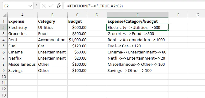 Compare this with TEXTJOIN in the modern Excel 365 environment, where the entry is easy to build and to follow.